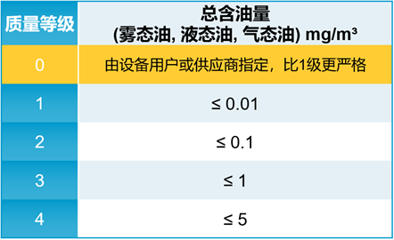 標準ISO 8573-1《壓縮空氣第一部分:污染物和純度等級》中明確定義,含油量分為5個等級,質量等級的數字越低,代表壓縮空氣品質越高。當壓縮空氣中的總含油量,符合質量等級0級時,就是通常所說的符合ISO 8573-1 CLASS 0的無油壓縮空氣。